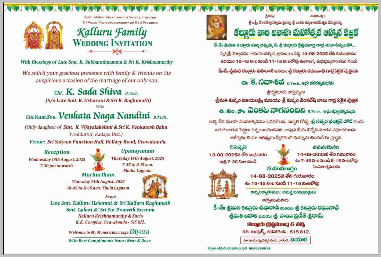 Sumuhurtham - 10.45 to 11.15 AM IST, Sri Satyam Function Hall, Uravakonda.